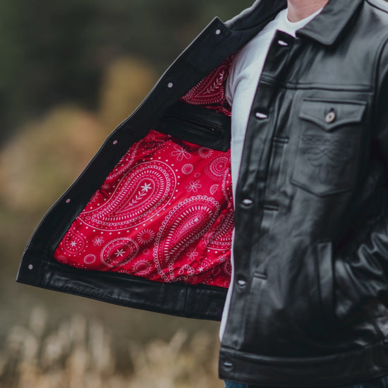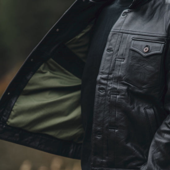 Built for the narrow road. A full-grain black leather jacket crafted for men who stand apart, rugged, intentional, and anchored in conviction. Choose satin paisley or woodland-green twill lining.