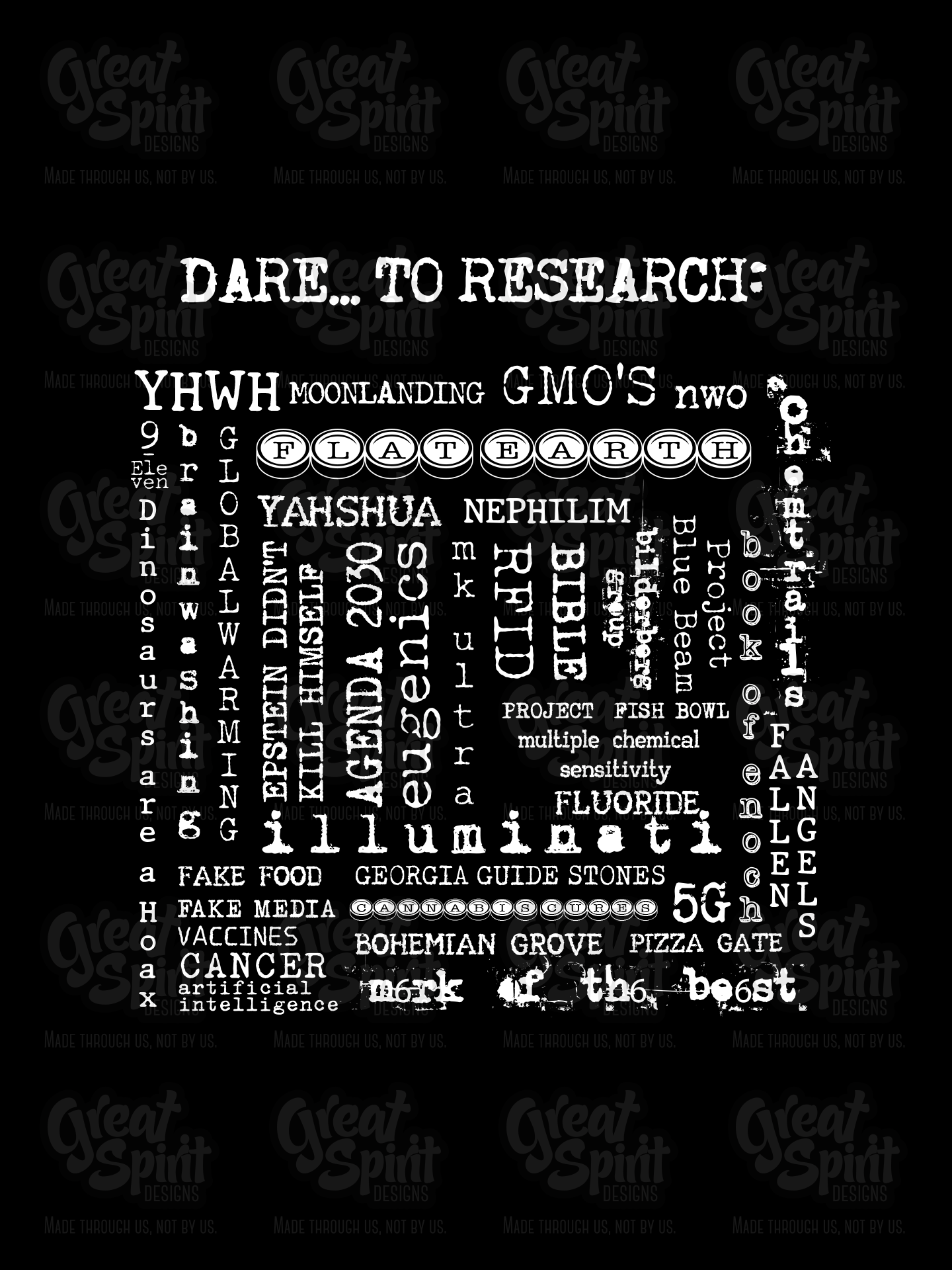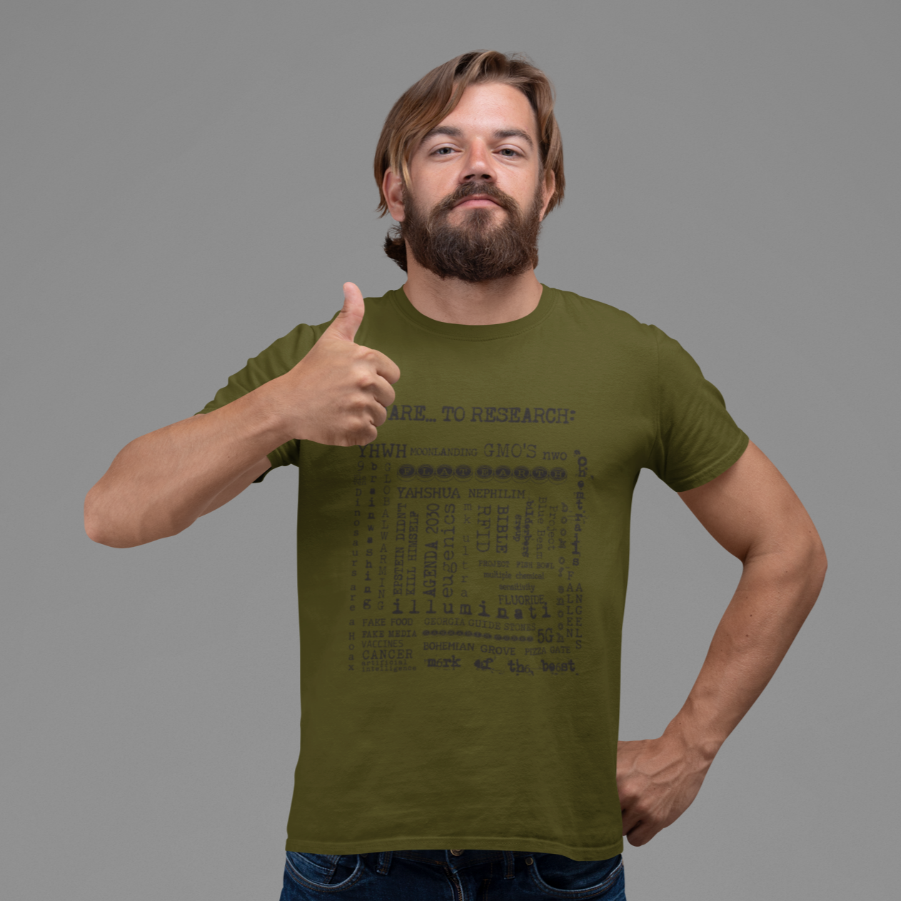 Perfect for truth-seekers, free-thinkers, and anyone who dares to question, the Dare To Research Tee is wearable conversation fuel.