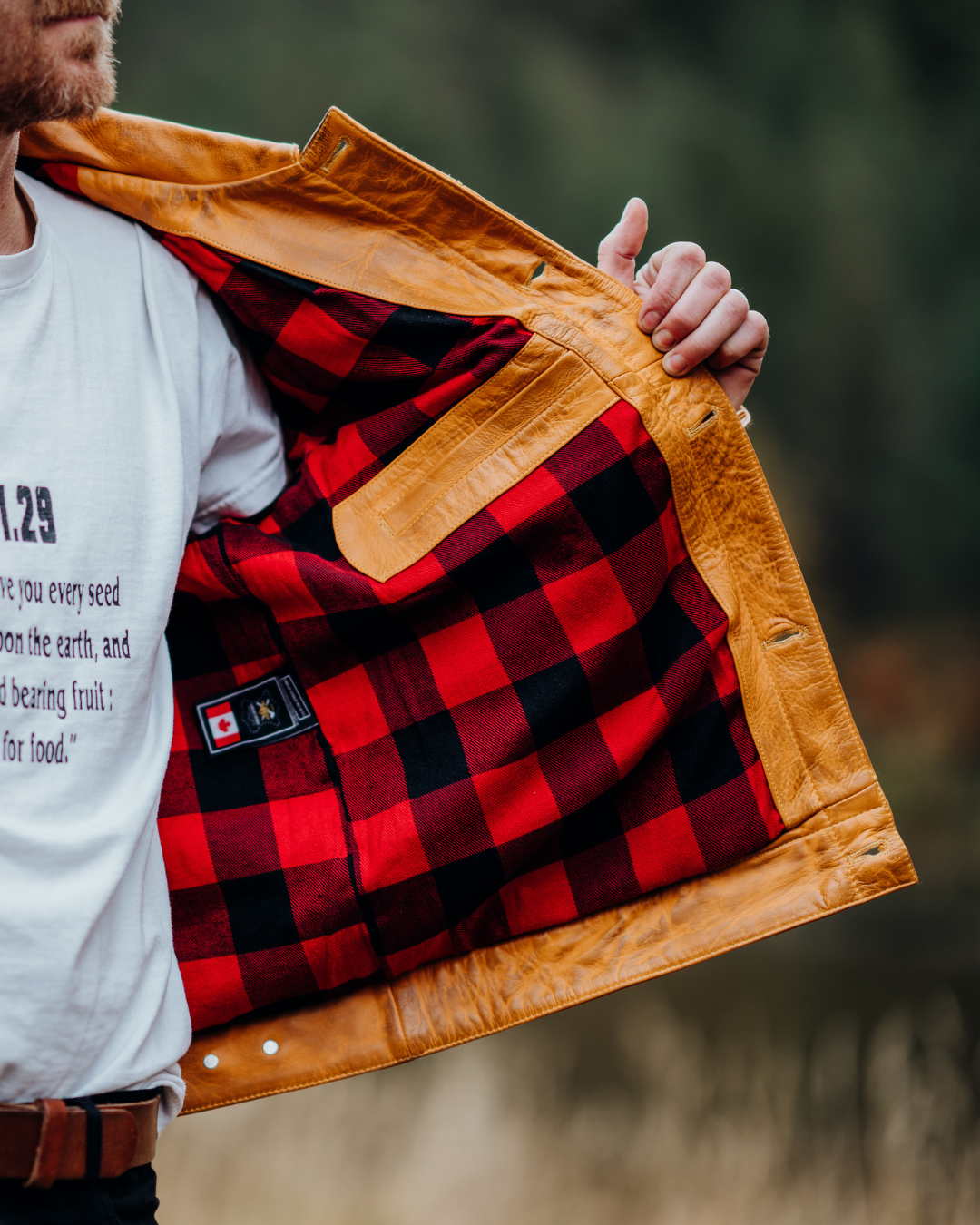 Inside, a warm buffalo-check lining pays tribute to the back-country of British Columbia, where our designs are born. Outside, subtle western lines, hand-cut pockets, and custom hardware strike a balance between refined structure and raw, lived-in grit. Western-style chest-pocket stitching brings character to the design, a small nod to the rivers, roots, and rugged terrain that inspire our craftsmanship.
